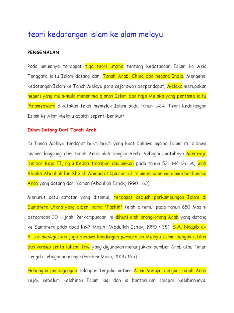 14 teori kedatangan islam ke tanah melayu 4. Keadaan ini berubah selepas kedatanagan islam yang membawa konsep tauhid dengan menafikan kewujudan tuhan yang banyak. Pada abad i hijriah, islam sudah masuk ke tanah sumatera. 15 teori ini dikemukan oleh john crowford dan dihujahkan oleh professor syed muhammad naquib 21 4. Sebelum kedatangan islam, masyrakat melayu menganut fahaman animisme. Penjelmaan tamadun melayu yang berasaskan agama islam inilah yang telah berjaya membentuk satu lakaran perjalanan bangsa melayu di tanah melayu terutama di malaysia. Saya pasti masih ramai yang tak tahu dan tak percaya. • anak lelaki diutamakan dalam pembahagian pusaka (bertepatan denga hukum faraid. Dengan adanya islam di alam melayu, pengaruh daripada bahasa dan perkataan juga telah diberi nafas baru terhadap bahasa melayu. See more of empayar islam malaysia tanah melayu on facebook. Kedah dikatakan antara negeri terawal yang menerima islam di tanah melayu. Secara umumnya terdapat tiga teori yang berbeza mengenai kedatangan islam. Dalam hal pemikiran islam, tentu saja apa yang terjadi di malaysia atau tanah melayu secara umum menarik untuk dikaji.